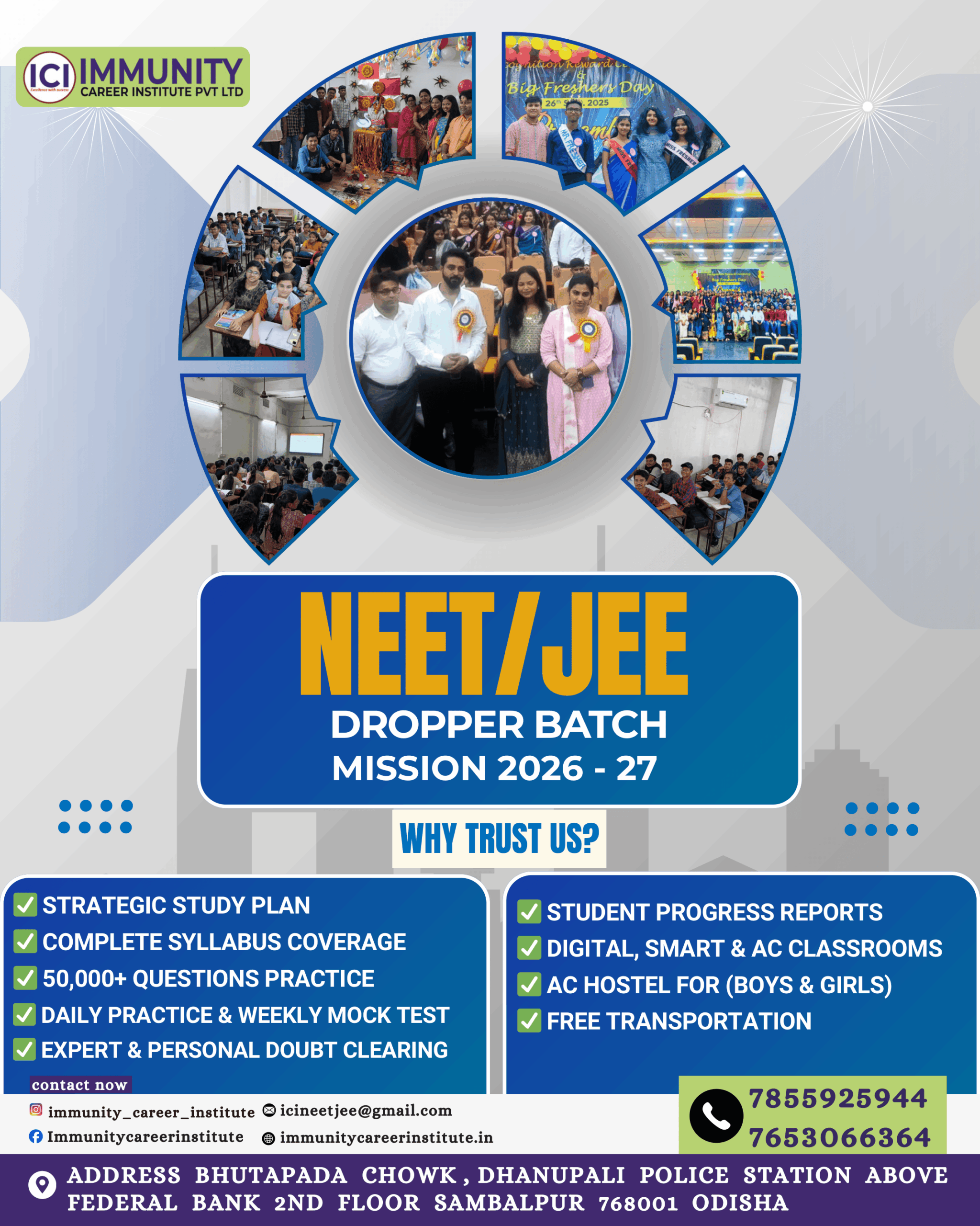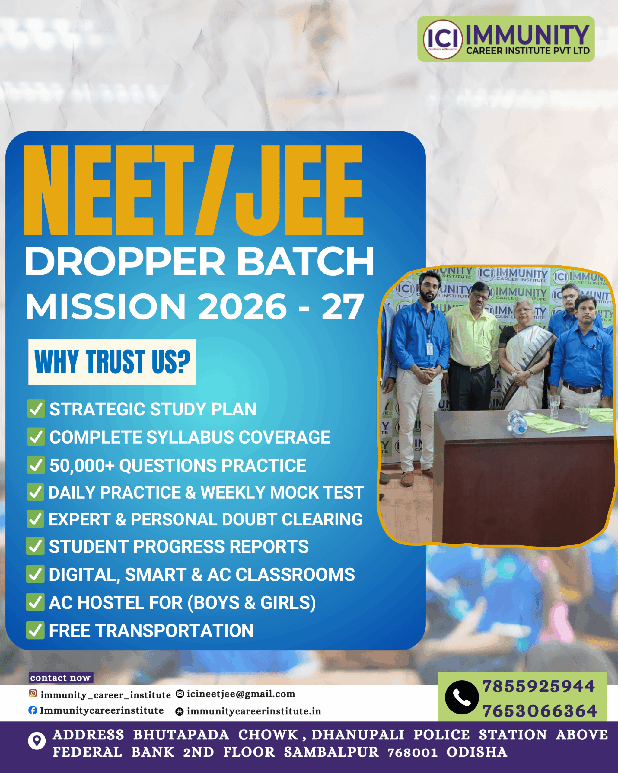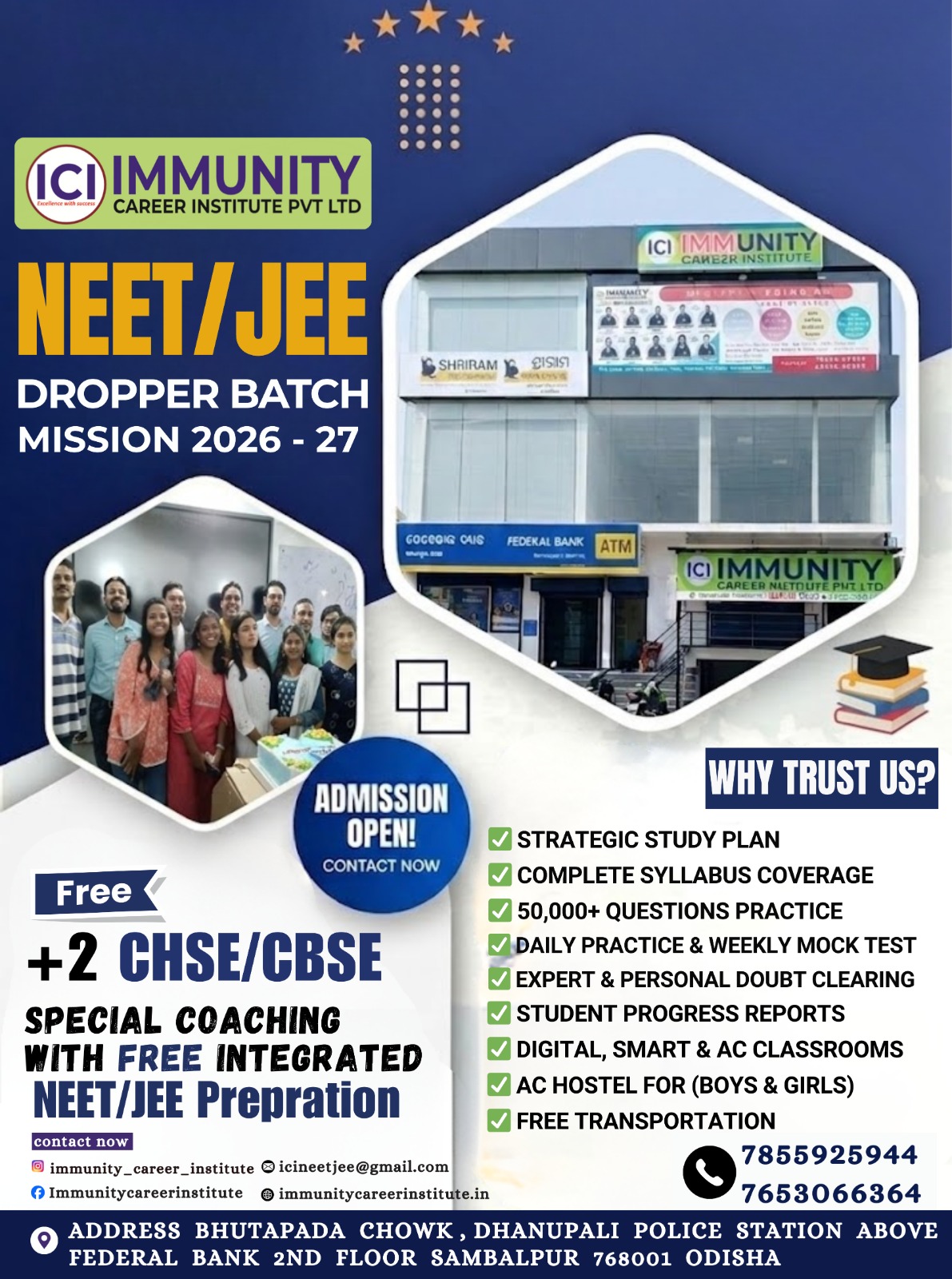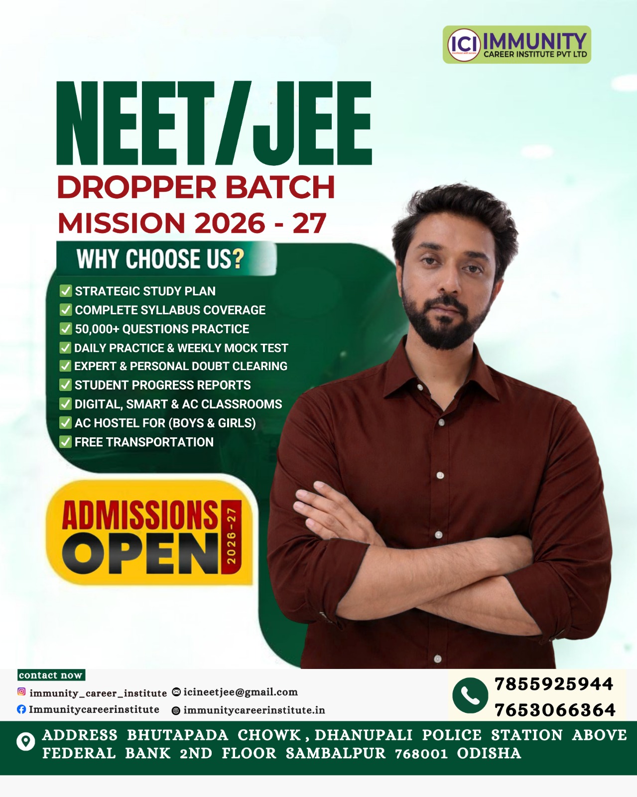 - Dropper batch for 12th appearing students (course included preparation for NEET, OUAT, IISER, NISER etc)